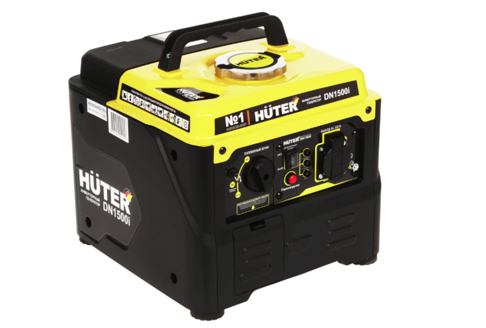 Электрогенератор Huter DN1500i оснащен четырехтактным одноцилиндровым двигателем, объем которого соответствует 53.3 см³. Его запуск производится ручным способом. Для своей работы устройство использует бензин марки АИ-92. Топливный бак рассчитан на 4.2 л бензина. На полном баке время работы электрогенератора достигает 6 часов. Объем масла в картере двигателя равен 0.26 л. Оснащенное одной розеткой 220В/16А устройство выдает стандартное напряжение 220 В. Показатели максимальной и номинальной выходной мощности равны 1.2 кВт и 1.1 кВт соответственно.