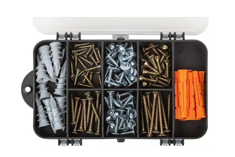 Состав набора: 21116 Шурупы желтопассированные, универсальные 3 х 16 20 шт 21316 Шурупы желтопассированные, универсальные 4 х 16 20 шт 21330 Шурупы желтопассированные, универсальные 4 х 30 10 шт 21340 Шурупы желтопассированные, универсальные 4 х 40 10 шт 21560 Шурупы желтопассированные, универсальные 5 х 60 10 шт 22019 Саморезы черные по гипроку к дереву 3,5 х 19 50 шт 22025 Саморезы черные по гипроку к дереву 3,5 х 25 50 шт 22035 Саморезы черные по гипроку к дереву 3,5 х 35 40 шт 22713 Саморезы для листовых пластин, остроконечные 4,2 х 13 25 шт 22716 Саморезы для листовых пластин, остроконечные 4,2 х 16 20 шт 23852 Дюбель универсальный с бортиком (U) 6 х 42 8 шт 23854 Дюбель универсальный с бортиком (U) 8 х 52 5 шт 24125 Дюбель "Driva" 12 х 32 10 шт 65645 Ящик для крепежа (органайзер) двухсторонний 7" ( 175х106х46 мм ) 1 шт