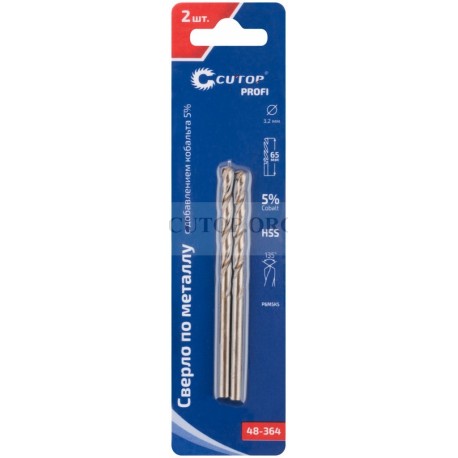 CUTOP 48-32-10 Сверло по металлу Cutop Profi с кобальтом 5%, 3,2 x 65 мм (10 шт) Профессиональное сверло по металлу CUTOP Profi с добавлением кобальта 5% для профессионального использования. Класс точности А1. Цилиндрический хвостовик. Угол заточки 135°. Предназначено для сверления отверстий в углеродистых и легированных сталях, серых и ковких чугунах, цветных металлах и пластике. Материал: быстрорежущая HSS сталь c добавлением кобальта 5% (Р6М5К5). Упаковка: подвесной пластиковый бокс.