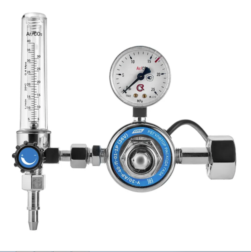 В корпус регулятора встроен подогреватель на 36В. Электроподогреватель обеспечивает работоспособность регулятора при низких температурах окружающей среды (до -30С). Корпус регулятора изготовлен из алюминия (литье под давлением). Колба ротаметра изготовлена из прочного пластика, которая имеет две шкалы Ar/CO2.